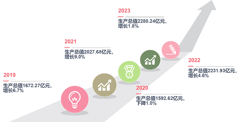 初步核算,全年地区生产总值(GDP)2280.24亿元,按不变价计算比上年增长1.8%。其中,第一产业增加值240.13亿元,增长4.5%;第二产业增加值1391.08亿元,增长0.1%;第三产业增加值649.03亿元,增长3.7%。三次产业构成为10.5:61.0:28.5。人均生产总值100695元,按不变价计算比上年增长2.0%。非公有制经济实现增加值683.14亿元,占生产总值比重为30.0%。