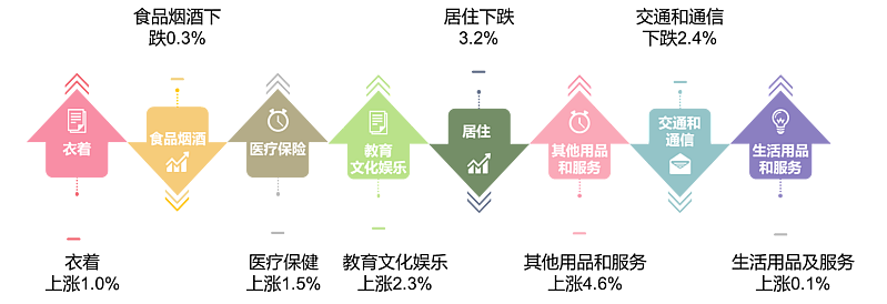 据宝塔区调查点数据显示:居民消费价格同比下跌0.4%。八大类呈“五升三降”:衣着上涨1.0%、医疗保健上涨1.5%、教育文化娱乐上涨2.3%、其他用品和服务上涨4.6%、生活用品及服务上涨0.1%;食品烟酒下跌0.3%、居住下跌3.2%、交通和通信下跌2.4%。