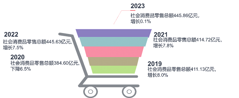全年实现社会消费品零售总额445.86亿元,比上年增长0.1%。其中:限额以上单位零售额182.16亿元,下降5.0%。