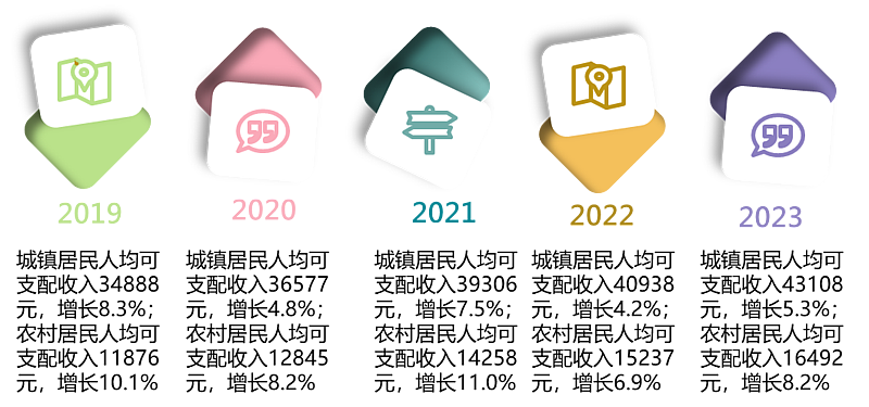 全年全体居民人均可支配收入31564元,增长6.4%。城镇居民人均可支配收入43108元,增长5.3%;农村居民人均可支配收入16492元,增长8.2%。全市城乡居民收入比为2.61:1,较上年缩小0.07个百分点。