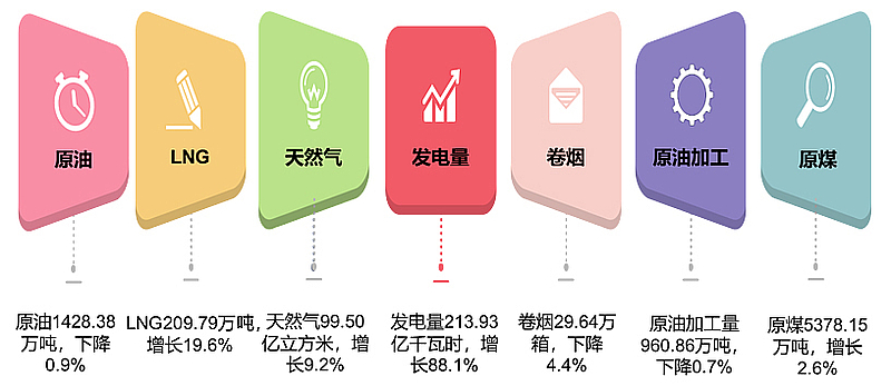 规模以上工业主要产品产量“四升三降”:原煤5378.15万吨,增长2.6%;LNG209.79万吨,增长19.6%;开采天然气99.50亿立方米,增长9.2%;发电量213.93亿千瓦时,增长88.1%。卷烟29.64万箱,下降4.4%;原油加工量960.86万吨,下降0.7%;原油1428.38万吨,下降0.9%。