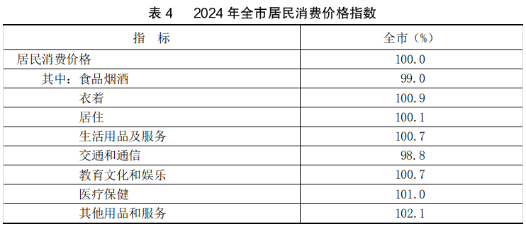 全年全市居民消费价格总指数(CPI)100.0%,其中:食品烟酒类价格下降1.0%,衣着类价格上涨0.9%,居住类价格上涨0.1%,交通和通信类价格下降1.2%。
