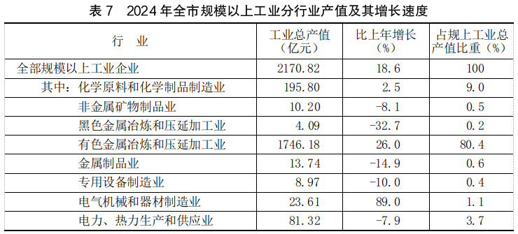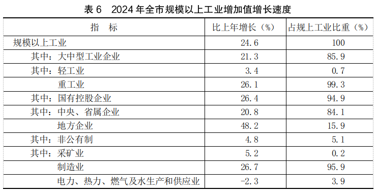 全年全市规模以上工业增加值比上年增长24.6%。分隶属关系看,中央、省属企业增长20.8%,地方企业增长48.2%。分轻重工业看,轻工业增长3.4%,重工业增长26.1%。分门类看,采矿业增长5.2%,制造业增长26.7%,电力、热力、燃气及水生产和供应业下降2.3%。