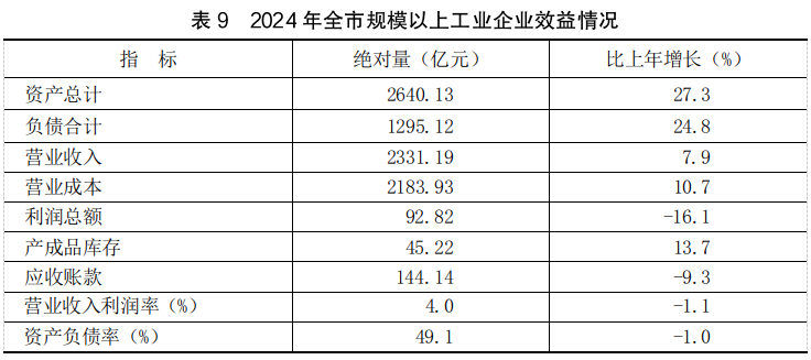 全年全市规模以上工业企业利润92.82亿元,比上年下降16.1%。规模以上工业企业每百元营业收入成本93.68元。年末规模以上工业企业资产负债率为49.1%。每百元营业收入中的费用2.52元。产成品存货周转天数为3.7天。营业收入利润率为4.0%。