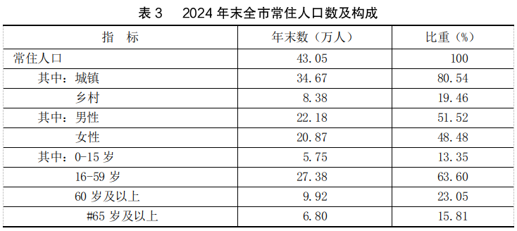 年末全市常住人口43.05万人,比上年末减少0.15万人。其中,城镇人口34.67万人,占常住人口比重(常住人口城镇化率)为80.54%,比上年末提高0.71个百分点。全年出生人口0.31万人,出生率为7.30‰;死亡人口0.46万人,死亡率为10.63‰;人口自然增长率为-3.33‰。