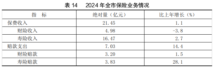 全年全市保险业保费收入21.45亿元,比上年增长1.1%。保险赔款支出7.03亿元,增长14.4%。财险机构综合赔付率66.36%。