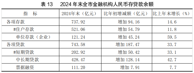 年末全市金融机构本外币各项存款余额741.84亿元,比上年末增长14.6%;金融机构本外币各项贷款余额743.59亿元,增长33.7%。