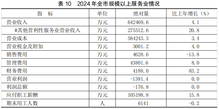 全年全市批发和零售业增加值比上年增长12.8%,交通运输、仓储和邮政业增加值增长4.5%,住宿和餐饮业增加值增长6.1%,金融业增加值增长7.0%,房地产业增加值增长9.1%。全年规模以上服务业企业营业收入增长4.1%。