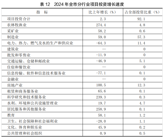 全年项目投资增长2.3%,其中制造业投资增长59.0%,电力、热力、燃气及水的生产和供应业投资下降64.3%,交通运输、仓储和邮政业投资下降46.9%,水利、环境和公共设施管理业投资增长19.7%。