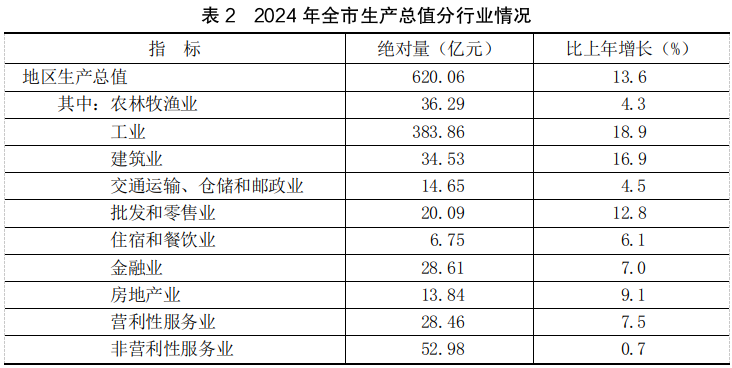 初步核算,全年全市地区生产总值620.06亿元,按不变价格计算,比上年增长13.6%,其中,第一产业增加值33.77亿元,增长4.6%;第二产业增加值418.25亿元,增长18.7%;第三产业增加值168.03亿元,增长5.4%。三次产业结构比为5.4:67.5:27.1。按常住人口计算,人均地区生产总值143784元,比上年增长14.1%。
