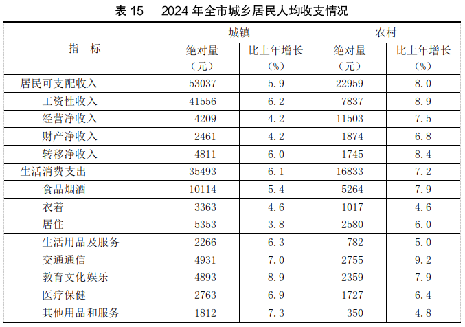 全年全市城镇居民人均可支配收入53037元,比上年增长5.9%,其中:永昌县40871元,增长5.8%;金川区58971元,增长6.0%。城镇居民人均生活消费支出35493元,恩格尔系数为28.5%。农村居民人均可支配收入22959元,增长8.0%,其中:永昌县21393元,增长8.1%;金川区28522元,增长7.8%。农村居民人均生活消费支出16833元,恩格尔系数为31.3%。