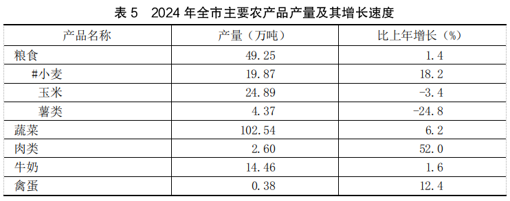 全年全市农作物播种面积135.13万亩,比上年下降2.9%。其中:粮食作物播种面积94.20万亩,下降0.2%;粮食产量49.25万吨,增长1.4%。蔬菜播种面积27.09万亩,下降7.1%;蔬菜产量102.54万吨,增长6.2%。