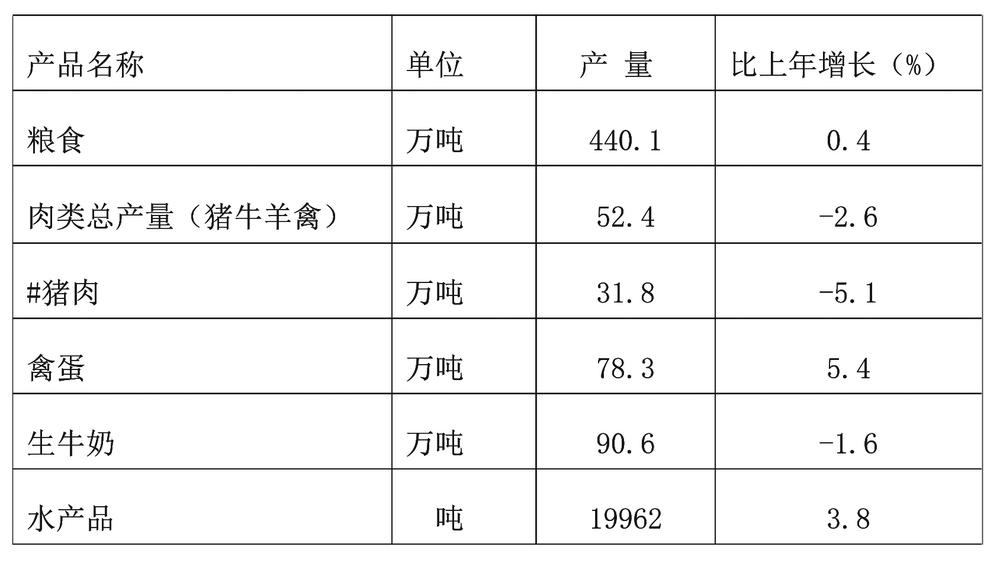 全年全市猪牛羊禽肉总产量52.4万吨,比上年减少1.4万吨,下降2.6%。其中:猪肉产量31.8万吨,下降5.1%;牛肉产量8.3万吨,增长0.8%;羊肉产量1.8万吨,下降1.8%;禽肉产量10.5万吨,增长2.5%。禽蛋产量78.3万吨,增长5.4%。生牛奶产量90.6万吨,下降1.6%。