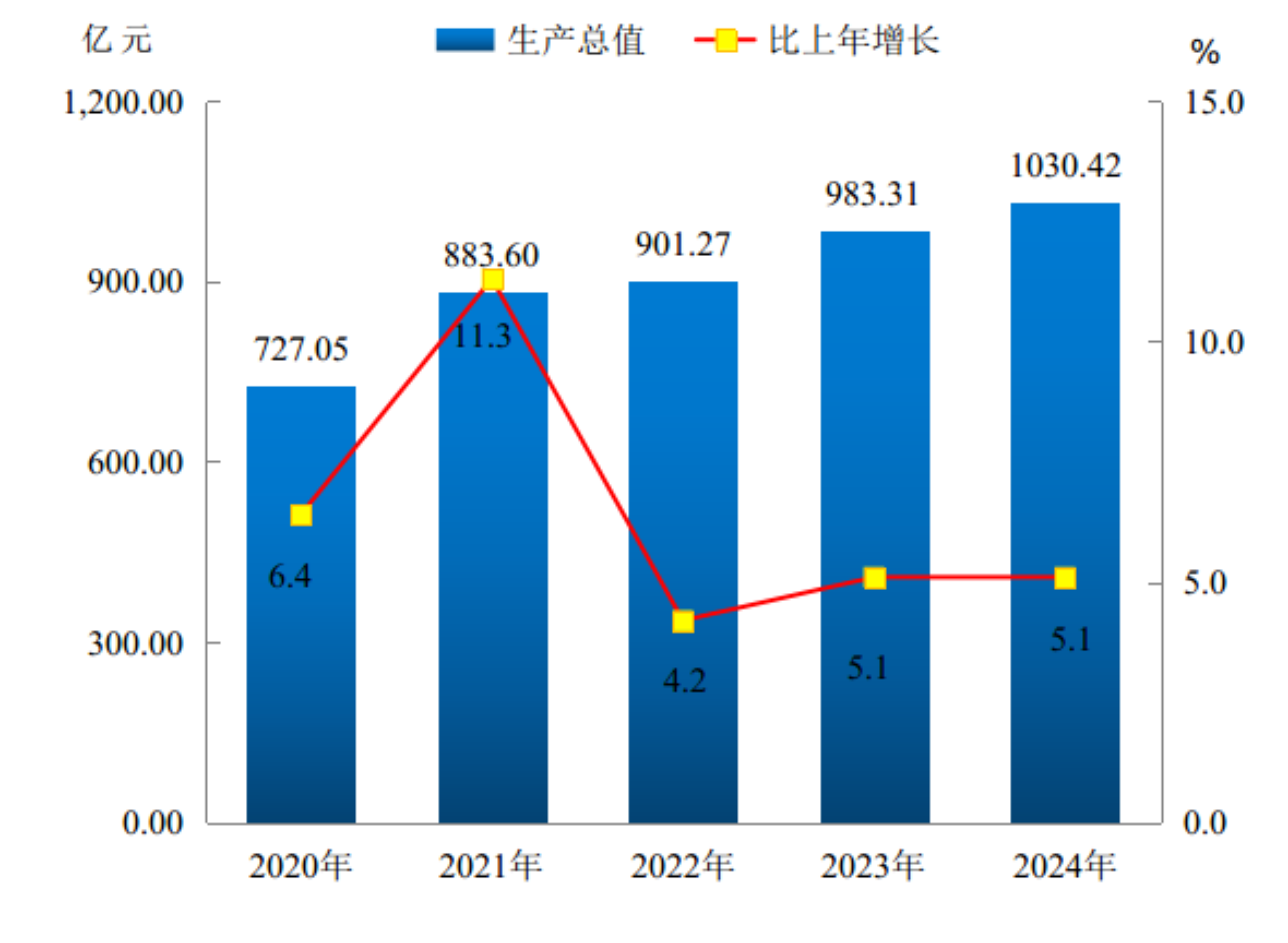初步核算,全年全市生产总值〔2〕(GDP)1030.42亿元,按不变价格计算,比上年增长5.1%。分产业看,第一产业增加值224.81亿元,增长5.3%;第二产业增加值399.79亿元,增长6.0%;第三产业增加值405.82亿元,增长4.2%。第一、二、三产业增加值占地区生产总值的比重分别为21.8%、38.8%和39.4%,三次产业对经济增长的贡献率分别为25.1%、40.2%和34.7%。按常住人口计算,全年人均地区生产总值50617元,比上年增长6.6%。