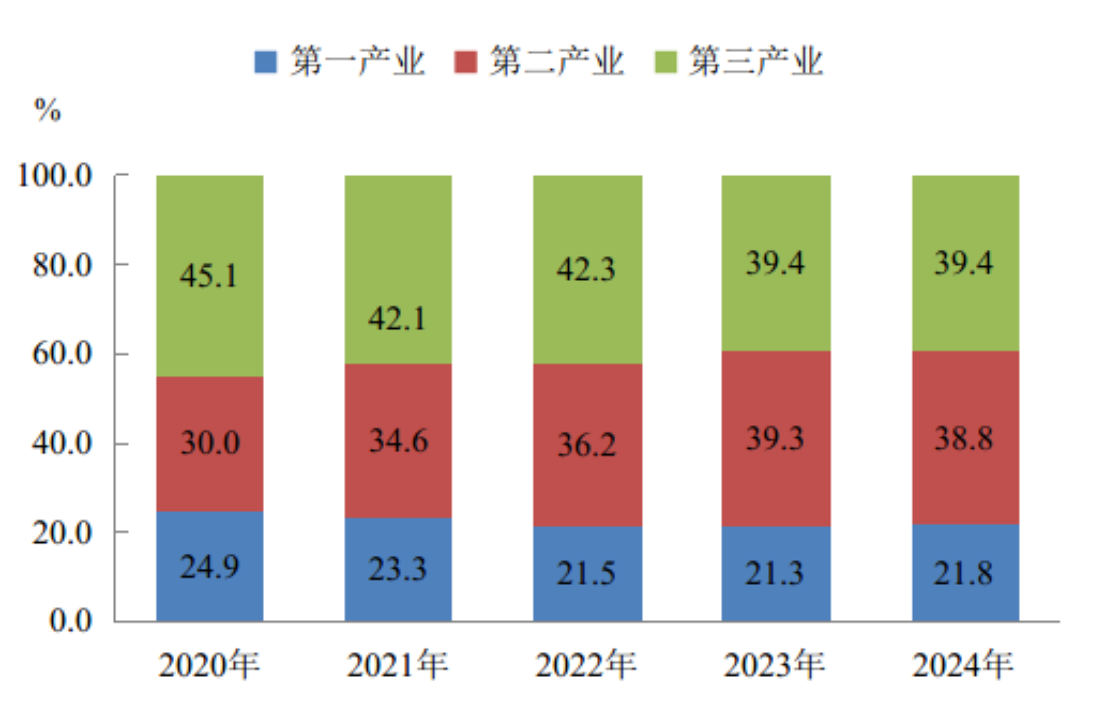 图2 2020—2024年来宾市三次产业增加值占GDP的比重