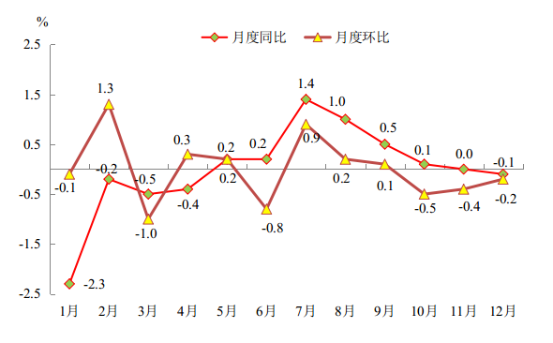 全年居民消费价格(CPI)与上年持平。八大类商品和服务价格中,医疗保健类上涨4.0%,教育文化娱乐类上涨1.8%,衣着上涨0.6%,其他用品及服务上涨0.3%,交通通信类下降1.8%,生活用品及服务下降1.2%,居住类下降0.8%,食品烟酒类下降0.5%。