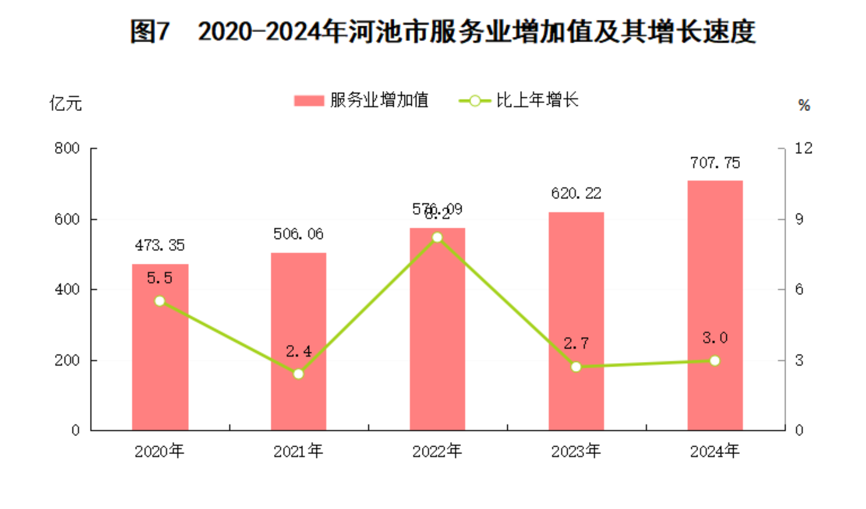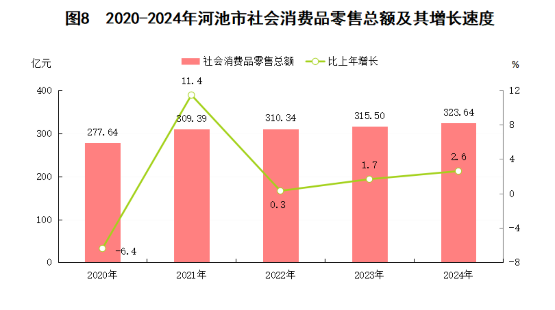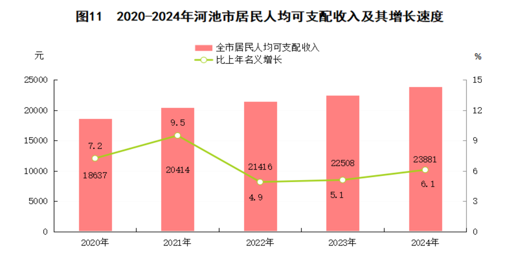 [1]本公报中2024年数据均为初步统计数,最终数据以《河池统计年鉴(2025)》为准。部分数据因四舍五入的原因,存在总计与分项合计不等的情况。