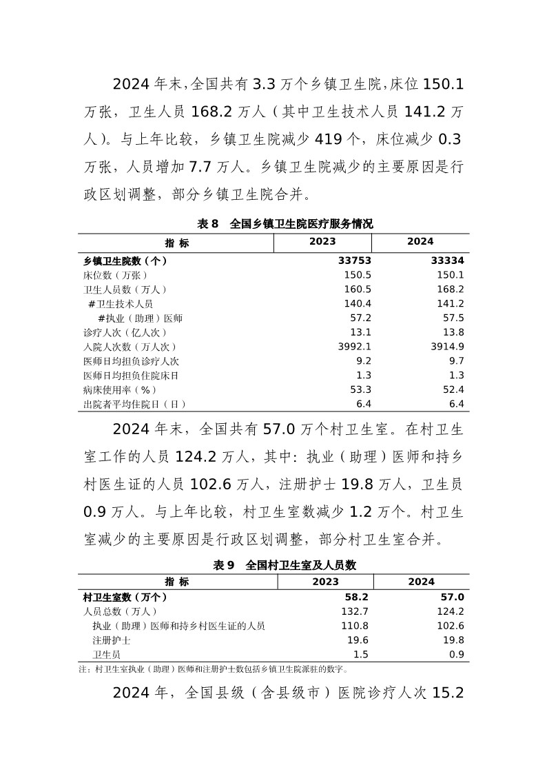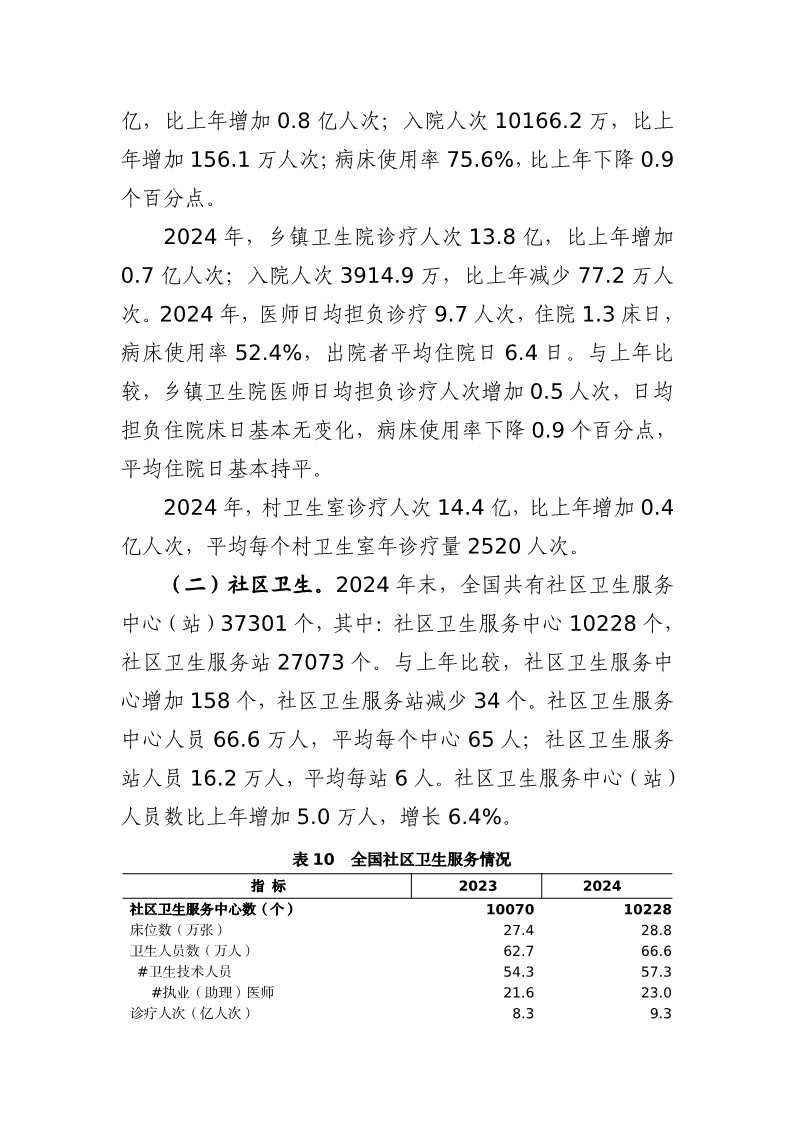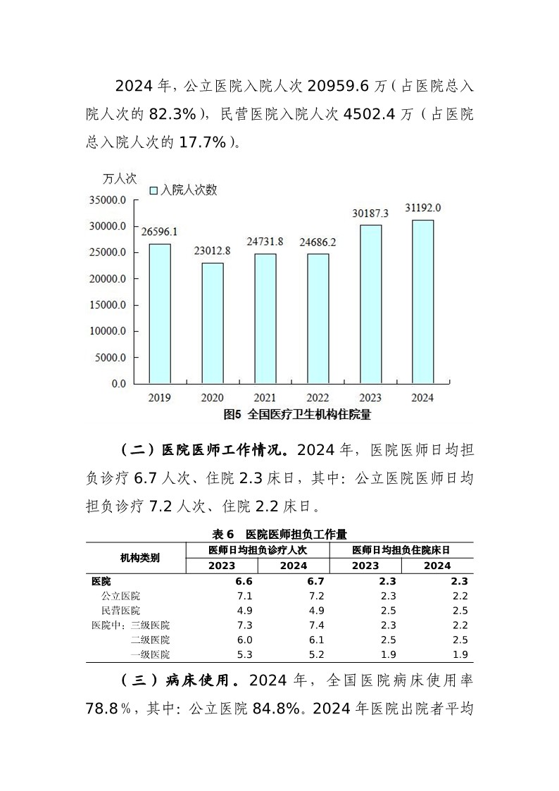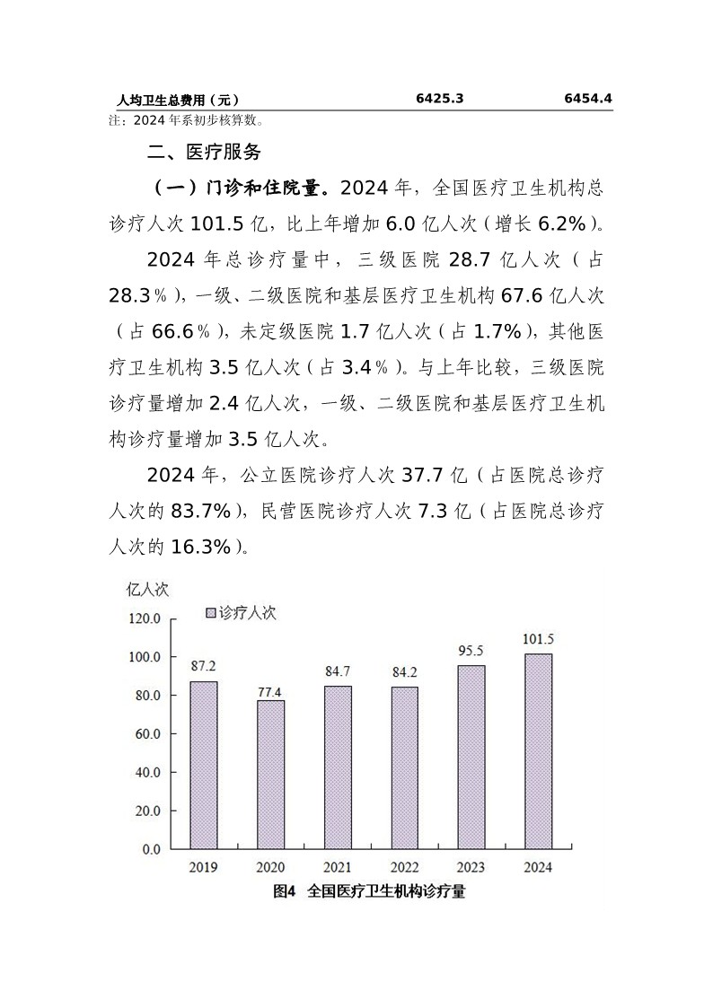 《公报》指出,我国医疗服务提供量和效率同步提升。2024年,全国医疗卫生机构总诊疗人次101.5亿,比上年增加6.0亿人次;入院人次31192.0万,比上年增加1004.7万人次。全国医院病床使用率达78.8%。