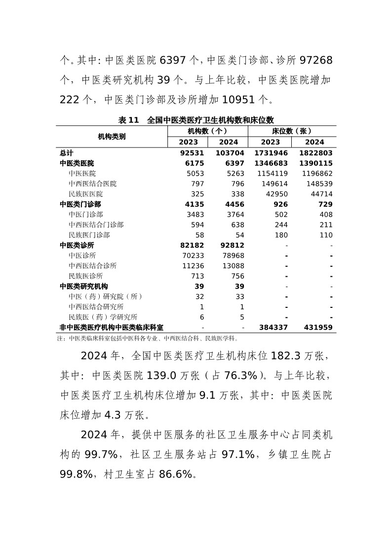 在中医药服务方面,根据《公报》,2024年,全国中医类医疗卫生机构总数103704个,中医药卫生人员总数115.9万人,总诊疗人次16.8亿。