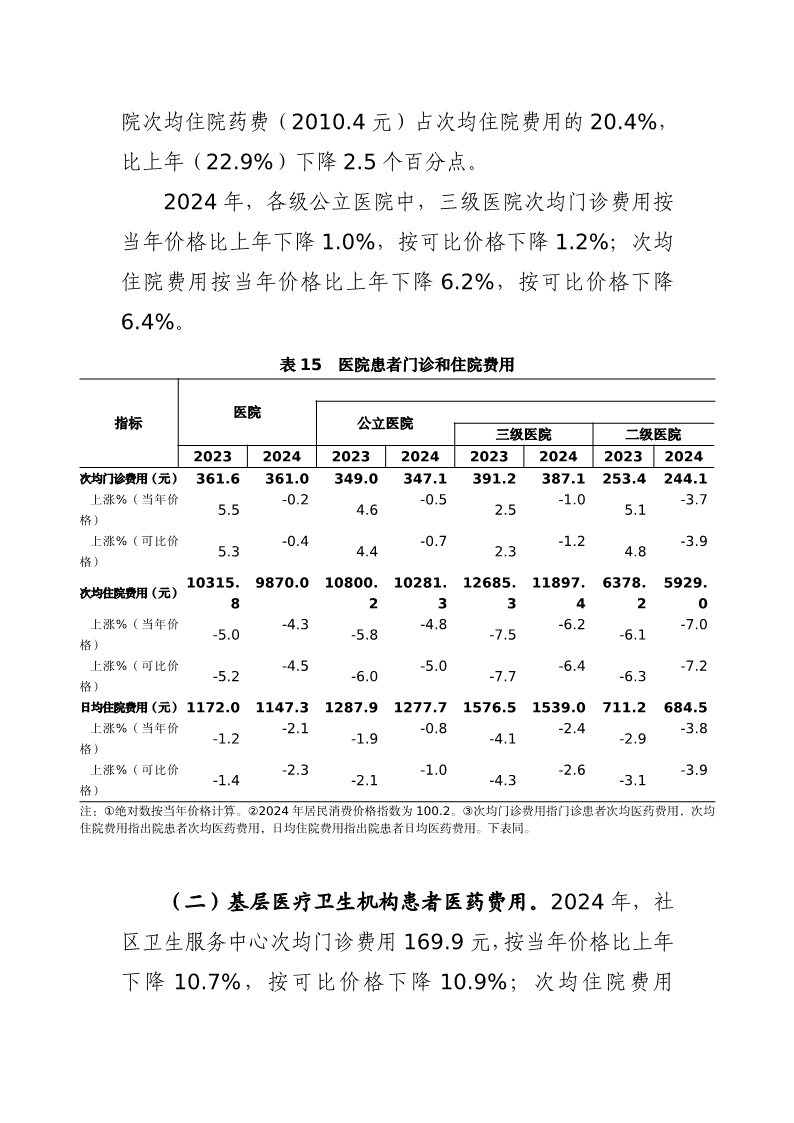 《公报》表明,次均医疗费用控制有成效。2024年,医院次均住院费用9870.0元,按当年价格比上年下降4.3%,按可比价格下降4.5%;次均门诊费用361.0元,按当年价格比上年下降0.2%,按可比价格下降0.4%。
