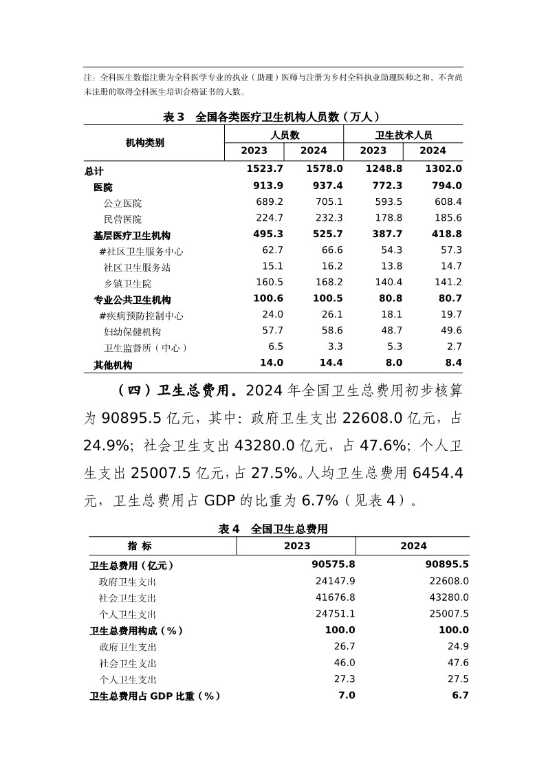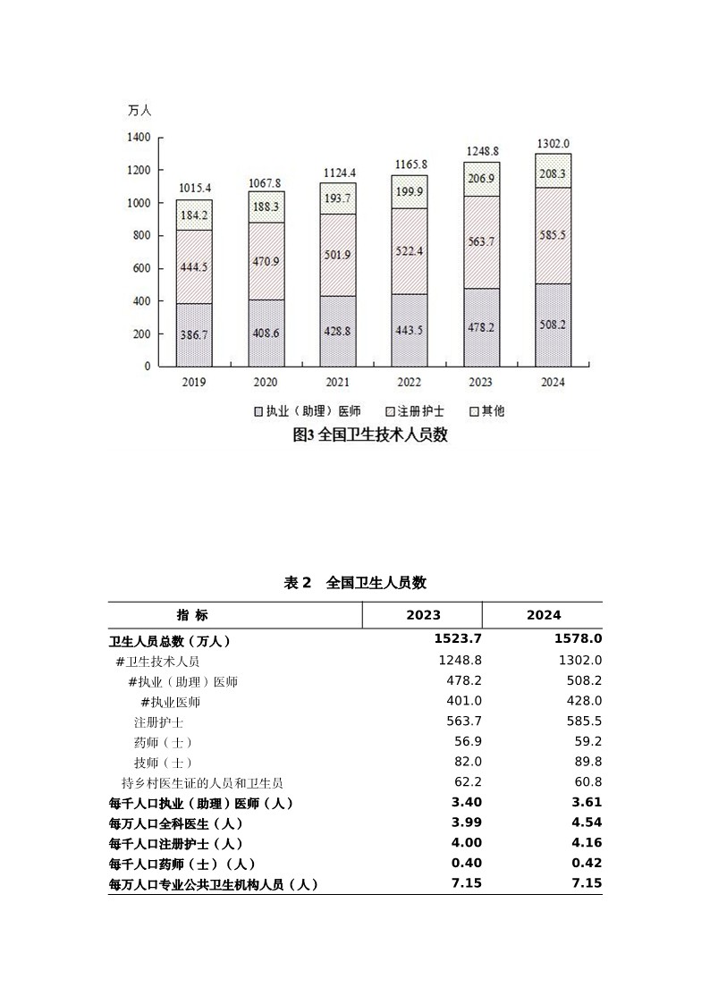 《公报》显示,我国卫生资源总量持续稳步增长。2024年末,全国医疗卫生机构总数1093551个,比上年增加22766个。2024年,每千人口执业(助理)医师3.61人,每千人口注册护士4.16人,每万人口全科医生4.54人。